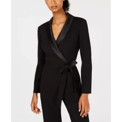 A double-sided matte and satin tie adds a smart twist to this tuxedo-inspired jumpsuit from Adrianna Papell.