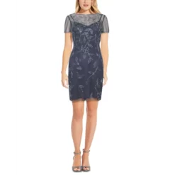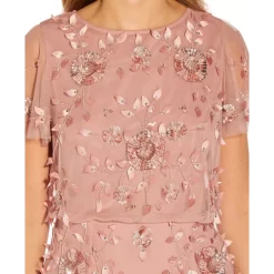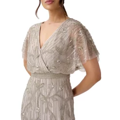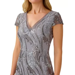 - Surplice neckline with satin lapels; back zipper closure