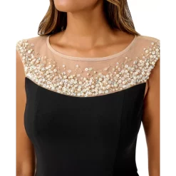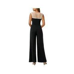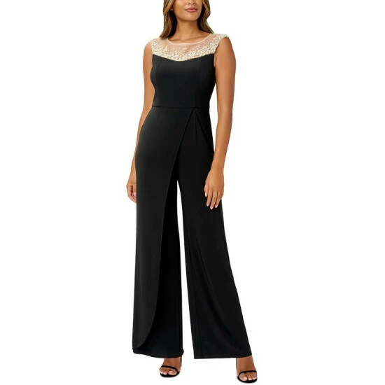 A skirt-style overlay falls from the waistline down one leg on this sleek jumpsuit from Adrianna Papell. Imitation pearls give the look a touch of glam.