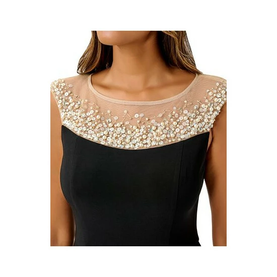 - Sequin and imitation pearl embellishments at yoke; half skirt overlay from waist to leg