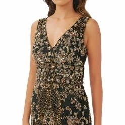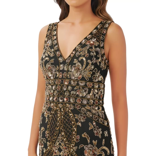 Regally radiant with beaded and sequined embellishments, Adrianna Papell’s flowing V-neck gown could make you feel like royalty.