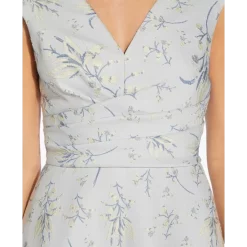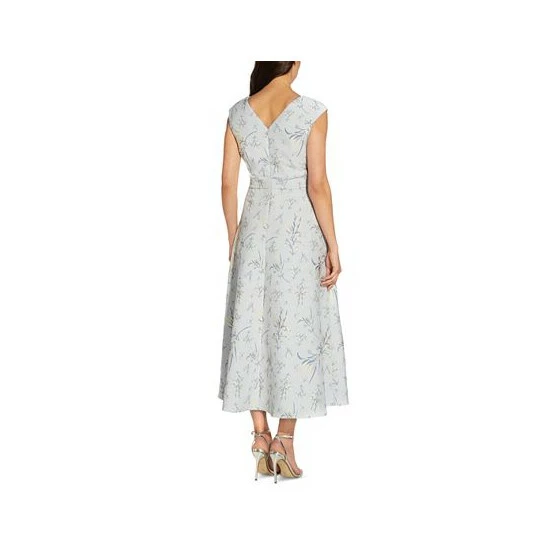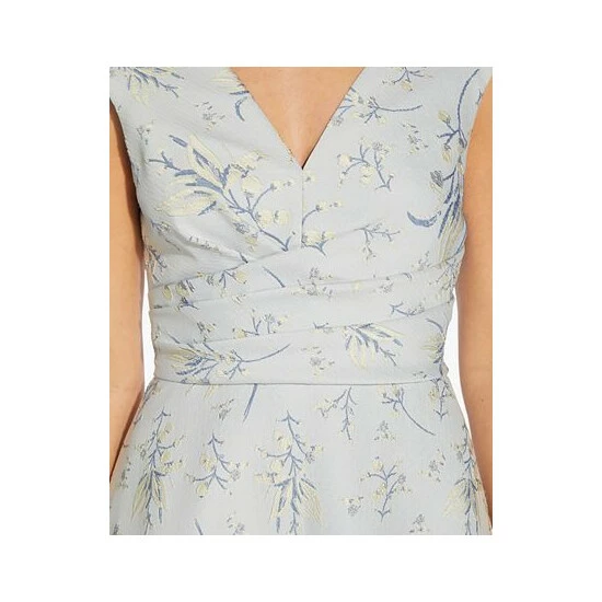 An elegant floral jacquard brings a graceful air to Adrianna Papell’s flattering fit and flare dress, a V-neck design finished with unique asymmetric pleats at the waist.