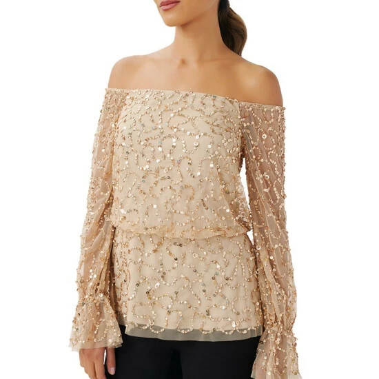 An evening of glamour is all yours the minute you slip on this gorgeous Adrianna Papell top. Completely decorated with glittery beads, this off-the-shoulder style is both elegant and attention-getting.