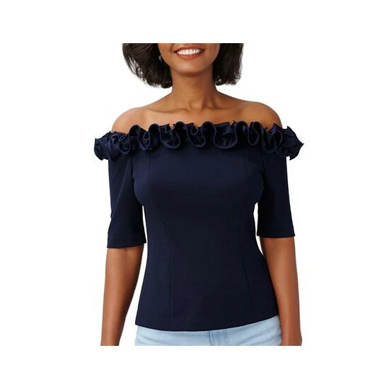 Look ravishing in ruffles with Adrianna Papell’s off-the-shoulder top.
