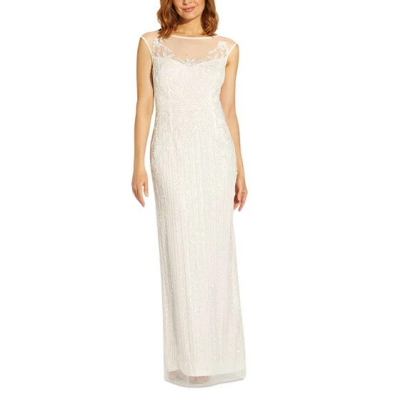 Create a sensation in this floor-length sequined illusion gown from Adrianna Papell, styled with a low V-back neckline.