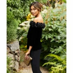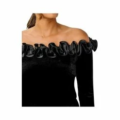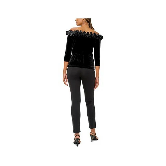 A ruffled neckline lends a chic finish to this velvet off-the-shoulder top by Adrianna Papell.